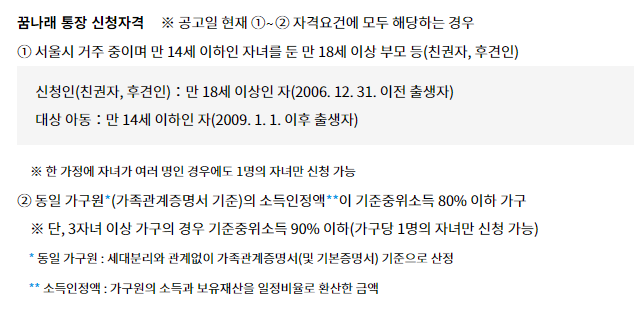서울시에 거주하는 만 14세 이하 자녀를 둔 만 18세 이상 부모라면 신청할 수 있습니다. 동일 가구원(가족관계증명서 기준)의 소득인정액이 기준중위소득 80% 이하여야 하며, 3자녀 이상 가구는 기준중위소득 90% 이하면 됩니다. 자녀가 여럿이어도 1명 앞으로만 신청할 수 있습니다.