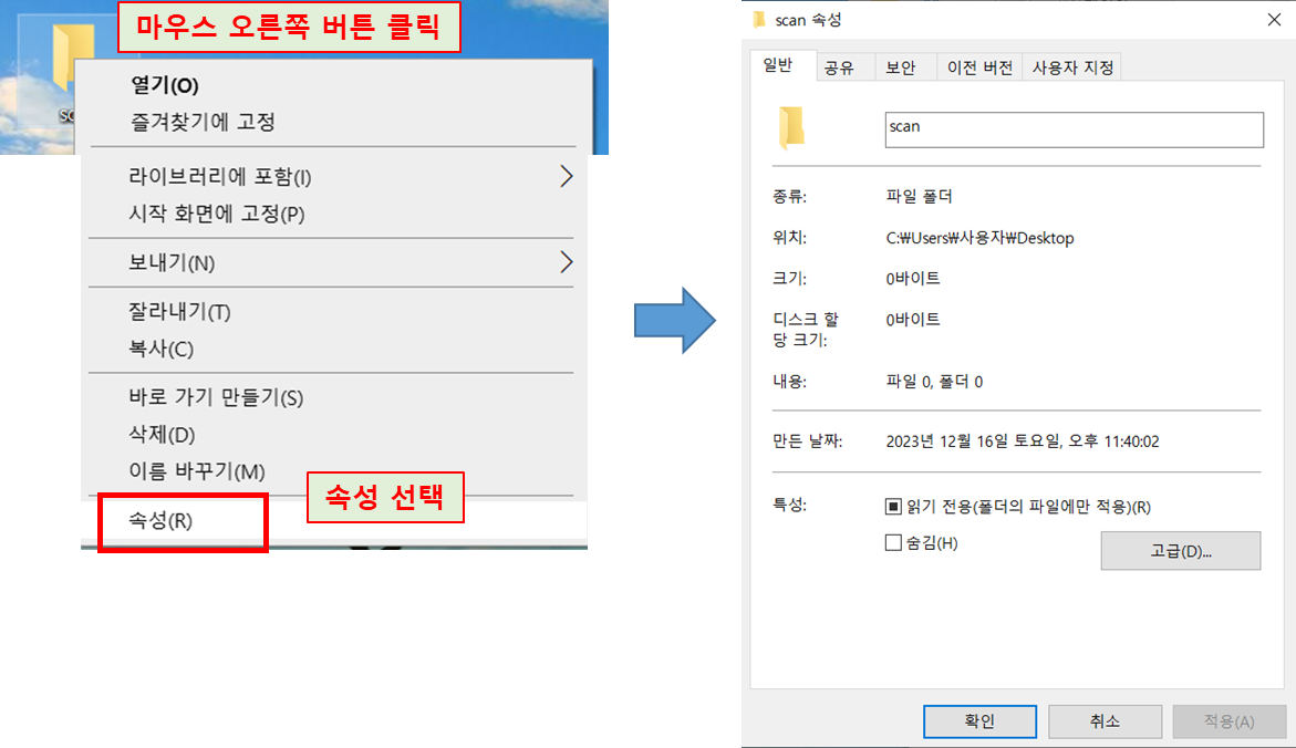 2. scan 폴더에서 마우스 우클릭을 눌러 맨 밑에 있는 [속성]을 눌러 속성 창을 띄워줍니다.