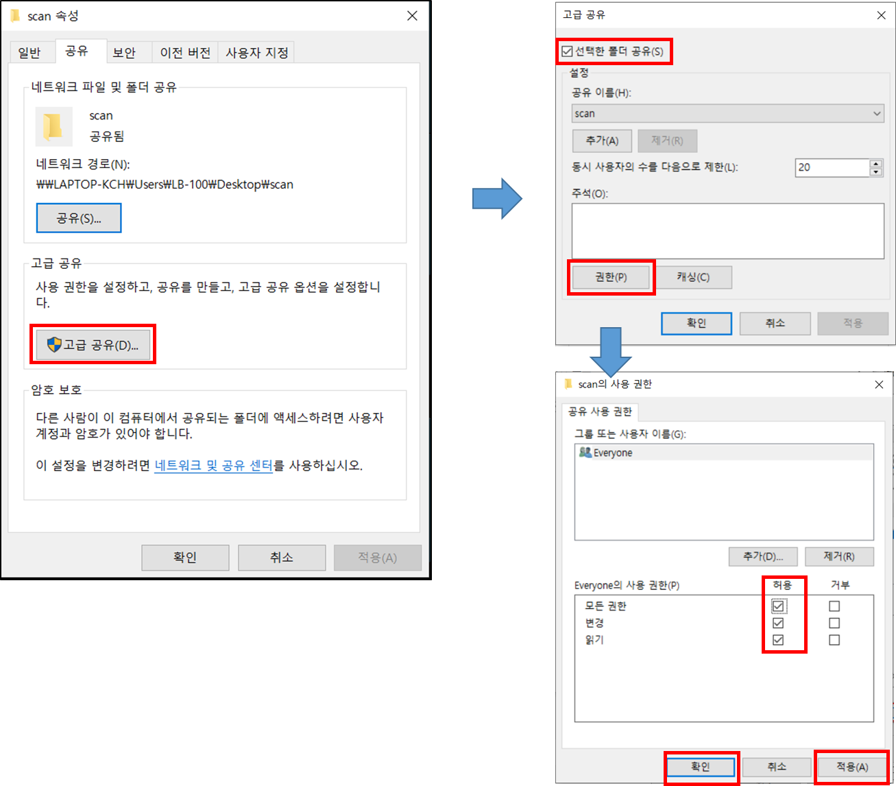 사용자 이름에서 Everyone를 선택 후 허용 부분에서 [모든 권한 허용 체크]를 해 줍니다.