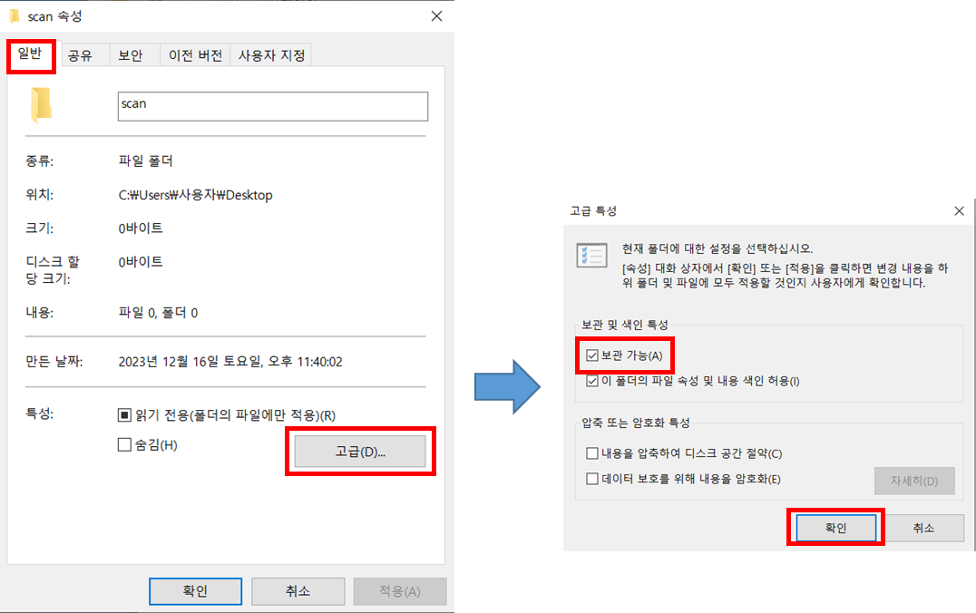 3. 상단 목록 중 첫 번째에 있는 [일반]에서 아래 특성에 있는 [고급]을 누르고 나오는 화면에서 [보관 가능] 선택 후 [확인]을 눌러줍니다.