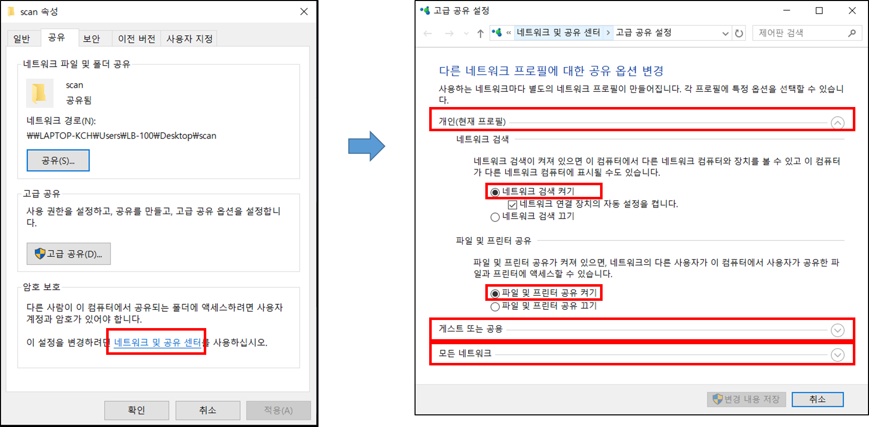 네트워크 및 공유센터에서 [개인(현재 프로필)], [게스트 또는 공용], [모든 네트워크]를 각각 선택해