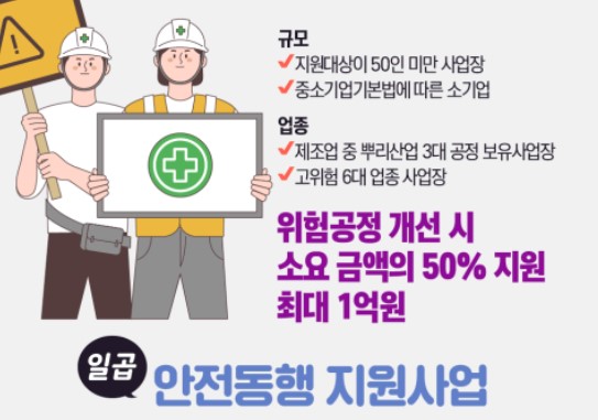 상시근로자 50인 미만 사업장이나 중소기업기본법에 따라 소기업에 해당되는 제조업 중 뿌리공정 및 고위험 6대 업종 사업장은 개선 비용의 50%를 최대 1억원까지 지원합니다.