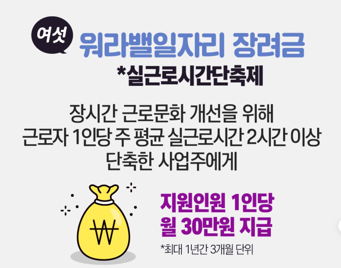 기존에는 전일제 근로자의 근로시간 단축 근무를 허용한 사업주를 대상으로 지원했지만 올해부터는 사업장 전체의 실근로시간을 단축한 사업주에게도 장려금을 지원한다고 하니 더 많은 근로자의 워라밸도 지키고, 기업 부담도 줄어들겠죠~